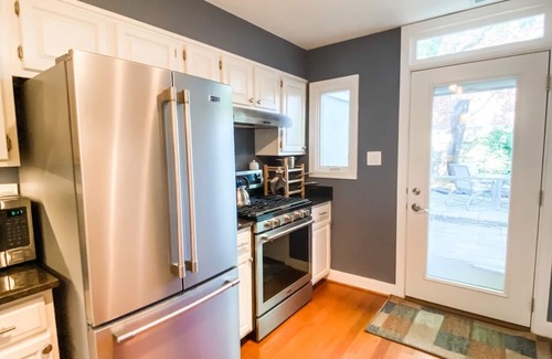The living room, half-bath, kitchen, dining area and access to the private backyard are all on the main floor. The kitchen has a 3-door French refrigerator with icemaker, dishwasher, gas stove, microwave, Keurig coffee maker, in addition to many tools and utensils for all your in-home meal preparations.