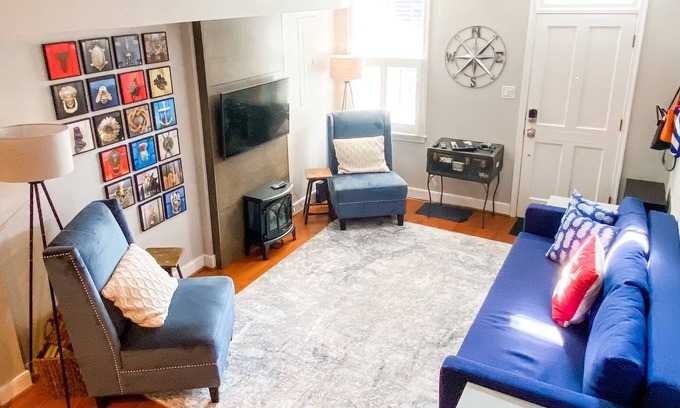 This cute townhome has historic charm and modern amenities. It features two bedrooms, one full bathroom, one half-bath, a fully equipped kitchen, private outdoor space, and plenty of room to comfortably spread out in the living and dining areas.