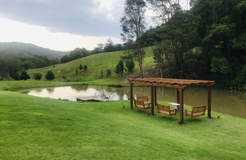 The Vale offers a Retreat to get away from the busy life: A truly Magnificent established 50 acre cattle farm in the Byron Shire, 10 mins from the ocean. A special place for your family to be together without all the city distractions; a place to share time with other families; or for good friends to enjoy company together in the beautiful Northern Rivers. There is no reason to leave if you don't want to. Relax on the dam pontoon during the day, settle in on the swings with a champagne in the evening, or the 6 person luxury spa/hot tub under the wisteria pavilion, and sit around the sandstone fire pit by night. Baby-sitting, Chef, Massages & Facials can be organized with prior notice. Approved FarmStay by Byron Shire Council (DA10:2017:715.1) and 4 bedroom B&B (CDC:2022/116.1). Contact the owner for discounts.
