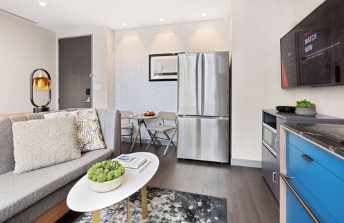 The residences are inspired by the city itself, with mid-century modernism serving as the design avenue. The color palette creates a cohesive aesthetic and the perfect backdrop for your stay. Every room boasts a very comfortable bed, 4K smart TV, and an elevated dedicated work space.