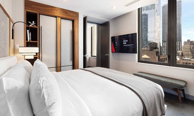 The Vibe on 5th IX is a beautifully designed 1-bedroom, 1-bathroom apartment near the Empire State Building. It offers a kitchen, Wi-Fi, air conditioning, and luxury building amenities for two guests.