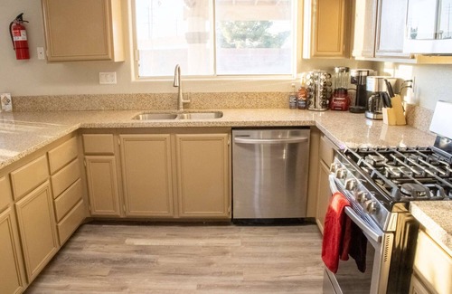 10 min east of the Strip off Flamingo Blvd. Enjoy this remodeled 3300 sq ft home with new everything! Features a triple-heated pool, covered patio with grill, city skyline views from 2 upstairs rooms, pool table, 100% cotton bedding, gel pillows, rainfall shower, full kitchen, fruit trees, dining area, office desks, & tankless water heater for groups.