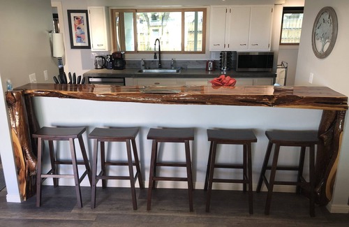 First floor of a 2-story house | 2 Bedrooms | 1 Reading Room (with daybed, trundle & writing desk) | 1 Bathroom | Full kitchen | Large LoveSactional sofa | 55" TV | Gorgeous hand-carved wood bar | Beautiful hand-made dining table featuring embedded maps of Zion National Park