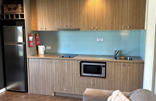 - Kitchenette with fridge and freezer, microwave, stovetop, sink, pots, pans chopping boards, knives and cutlery, iron, ironing board, electric kettle to make your stay like home.