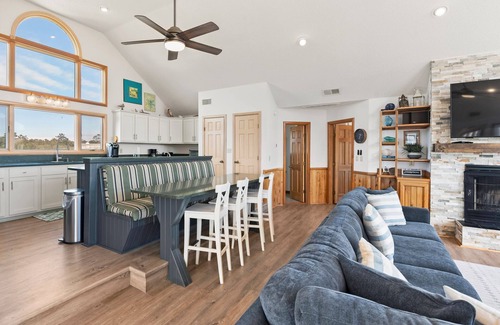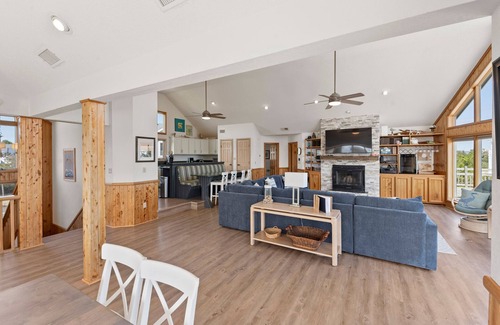 Comfortably furnished and well-maintained, The Wheelhouse offers the space and amenities you've been looking for along with convenient access to the beach less than 500 feet away. This custom-built home features an open-concept layout on the main level, with a spacious great room ideal for family gatherings. Floor-to-ceiling windows allow an abundance of natural light and take advantage of both ocean and lighthouse views, which can also be enjoyed outside from the expansive sun deck. Two dining tables plus built-in banquette seating allow everyone in your group to enjoy meals together. A spacious and well-stocked kitchen is designed with large families in mind, providing plenty of work room and counterspace while still being part of the action.