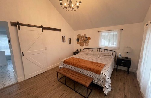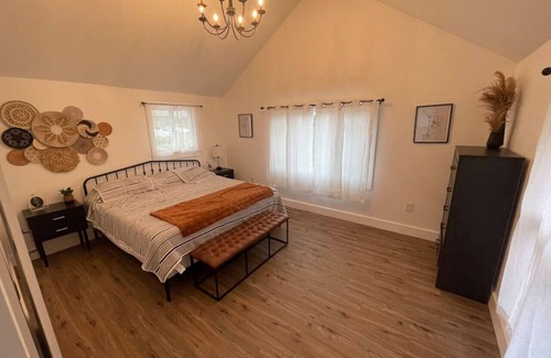 The upstairs primary suite includes a king size bed and a full bathroom including a relaxing soaking tub. The downstairs bedrooms include one room with two full beds, one with bunk beds, and one with a queen size bed. The backyard is yours to enjoy and make memories with loved ones and your pets as well, as the home is pet-friendly!
