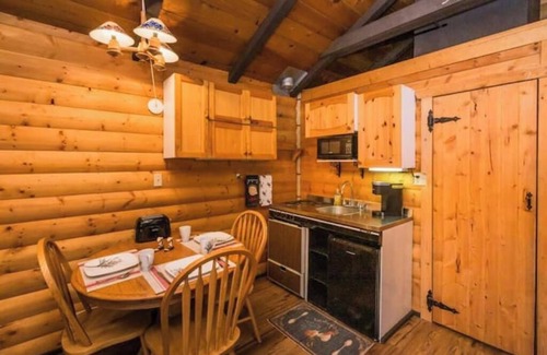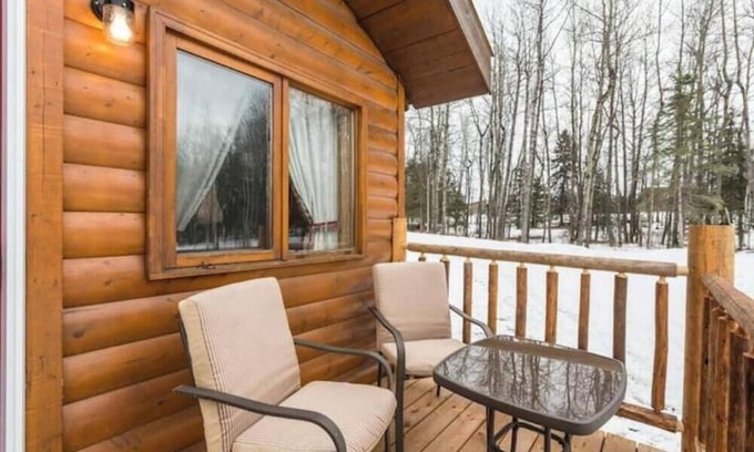 This cabin is 387 square feet and consists of a unique log double bed, a hide-a-bed, kitchen table and chairs, a kitchenette, and a 3 piece bathroom. Bedding and towels are included.