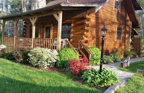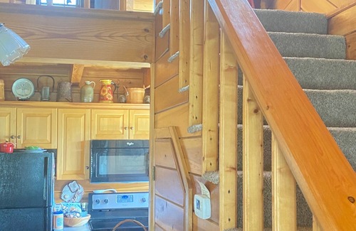 The Whitetail is a conventional-style log cabin, homey and appealing, with two bedrooms, two baths, living room, dining area and kitchen; stone wood-burning fireplace, central A/C-heat. The Whitetail is reminiscent of the simple, tranquil country life as you swing or rock on the front porch, listen and watch for beautiful songbirds, deer and other wildlife that often wander across the meadow. Gather your energy and pitch a horseshoe game, or play a few rounds of Bocci ball. 'Tis the peaceful life at Pipestem Place on Anam Cara Way!