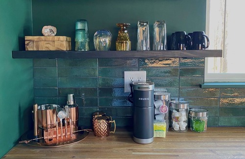 Inside you will find a fully stocked kitchenette, offering a very spacious sink, mini fridge with freezer, Keurig coffee maker, microwave and hot plate cook top for your cooking needs. Coffee pods, sugar, creamer, salt, and pepper as well as BBQ seasonings and olive oil are provided.