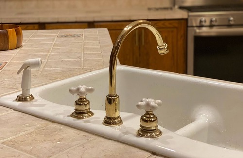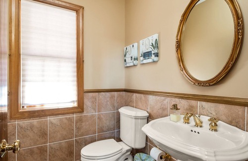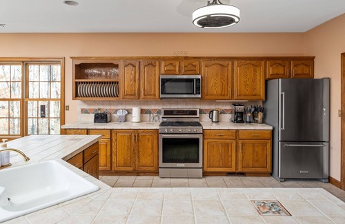 Nestled in the trees, the home has a cabin-like feel as soon as you arrive. It has been outfitted and fully-stocked to accommodate you whether you want a quiet writer's paradise among the chirping birds or for parties that want to have an extended family get-together.