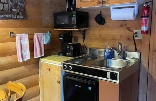 Included is: Kitchenette (no oven), microwave, mini-fridge, electric fire place, Keurig coffee maker, toaster, pots, and pans. This cabin also have a smart Roku TV now. Bring your passwords.