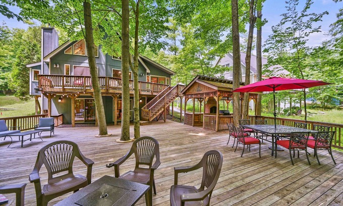 Nestled in The Hideout, a four-season Gold Star recreation community in Lake Ariel, PA, The Woodhill Hideout is your family's premier vacation home rental. This chalet-style home boasts four spacious bedrooms and three full baths. Due to new township regulations, we only allow 2 guests per bedroom plus an additional 2 (10 total guests). Walking through the doors, you are wowed by the two stories of windows and seasonal views of Roamingwood Lake through the towering trees surrounding the home. The main floor has a fully equipped kitchen to cook a gourmet meal for your family, a dining room with a reclaimed railroad tie table with seating for eight, and a spacious living room to relax, disconnect and chat with the family in front of the fireplace. The main floor has two bedrooms (King & Queen) with TVs and a full bath. Off the dining room, you will find the top deck with four comfortable rocking chairs, perfect for enjoying your morning coffee and the beautiful view and the music of mother nature.