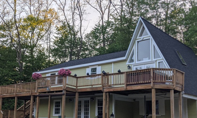 Private two bedroom upstairs apartment with sunny and spacious A-frame. This is a multi-unit listing. There will be noise from the downstairs apartment .Pets and kids welcome (pets require approval prior to booking) Cali king bed, private hot tub and sauna, foosball, in-house massage, large wraparound balcony style deck, cornhole, fire pit, parking, basketball court, fast Wi-Fi, barbecue, washer and dryer and a fully equipped kitchen. Three roll away beds and queen cabinet bed available for additional guests. Exit 16 from i-87, a 12 minute drive to downtown Saratoga springs, a 20 minute drive to lake George. 50 minutes from Gore, 15 minutes from West mountain, 45 minutes to the Adirondacks