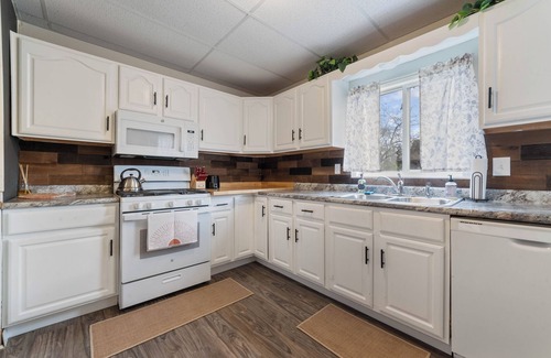 Our home has 3 bedrooms, 2 upstairs and 1 downstairs. It has a full kitchen equipped with everything you need to make your morning coffee, family dinner, and everything in between. Don't worry about packing your own coffee pods, utensils, or towels. We've got you covered!