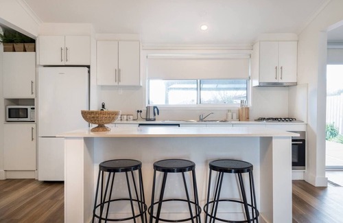This charming cottage embodies relaxed coastal living just a 10-minute stroll to Rosebud village and the bustling foreshore. Take in the views from Rosebud Pier, cool off with a dip in the ocean, or treat yourself with a spa day at Peninsula Hot Springs. This home blends character details with modern finishes including air-conditioning to create a true family-friendly retreat. It comes with alfresco dining, bbq, a firepit and play equipment and a full kitchen for your holiday catering.