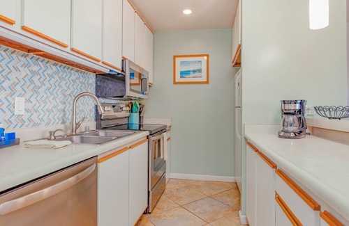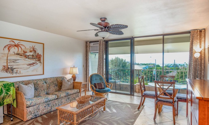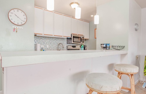 Inside, a mirrored entryway leads into a bright, open, and breezy living space, where you can bask in the comfort of air conditioning or slide open the floor-to-ceiling lanai doors to let in the fragrant, tropical breeze. It's a space equipped with every comfort, including a kitchen with updated appliances, both a breakfast bar and a glass-top dining table, and a cable TV for nightly movies. There's a second TV (with Chromecast only) in the bedroom to lull you to sleep.