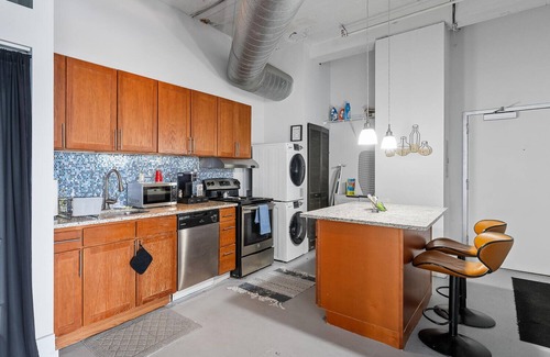 Immerse yourself in the heart of STL from this stylish, centrally-located retreat—ideal for group getaways. Situated right above the City Museum, this open-concept 2-bedroom, 1-bath space features sleek modern decor and ample room to unwind. Plus, enjoy the convenience of parking for one in a gated lot.