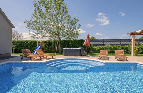 High quality and beautifully furnished, it has all the necessary amenities for a pleasant and relaxing holiday. Enjoy the warm rays of the sun on sun loungers by the spacious pool and relax in the outdoor jacuzzi. Relax while reading a book on the terrace or enjoy preparing delicious specialities on the barbecue in the summer kitchen in the outbuilding next to the pool, while the children can have fun in the playground with various facilities.
