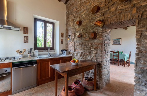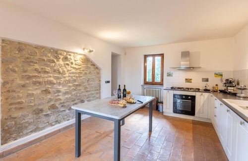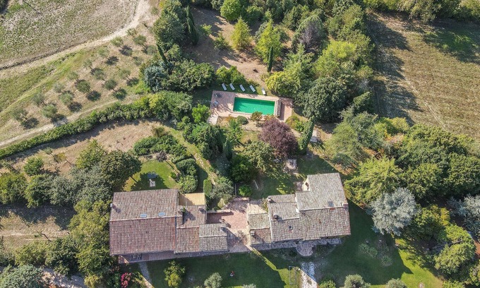 In a quiet location and with a great view over the countryside welcomes you this very spacious stone house in Umbria. Ideal for a vacation with the family or large number of friendly couples, you can enjoy the amenities of this domicile. Look forward to tastefully and stylishly furnished bedrooms and common areas. Play billiards together or enjoy private dinners or shared meals with the whole group on the balcony or terrace. The park-like garden invites you to linger and relax in many beautiful corners and crowns with the pool, which invites you to swim and sunbathe.