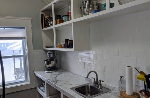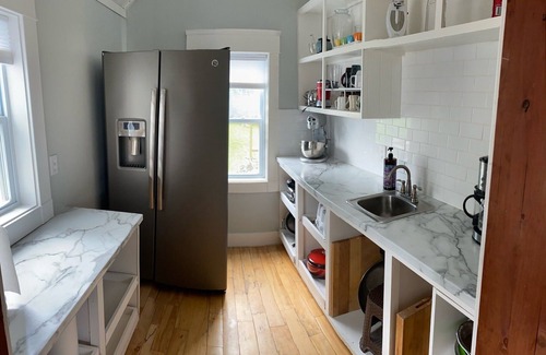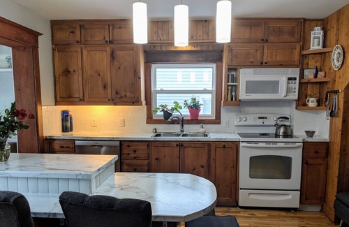 As you enter the house you are greeted with warmth and charm. Much of the 90 year old architecture has been kept and well maintained. On your left , an updated side room doubles as a mud room/ sitting room. To your right, the living space with large a comfortable sectional, chairs, large wall mounted TV , and fireplace. Next the dining area with dining table, chairs, lots of storage with games and dishes. All the comforts of home. On the right, past the mudroom and stairs, is the large eat in kitchen and pantry.