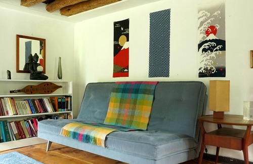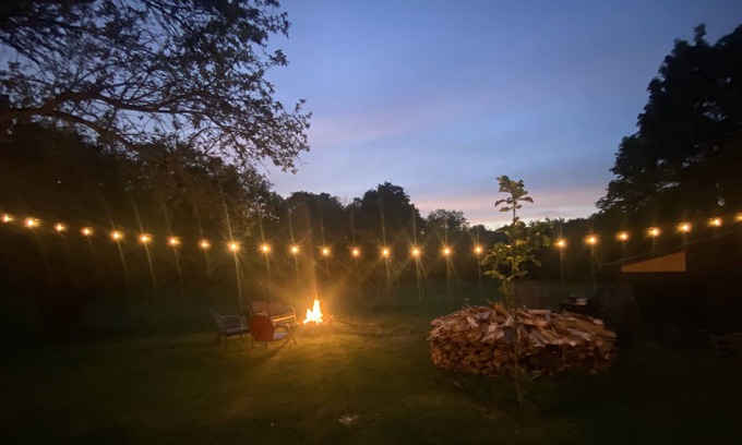 This light-filled two-story and cozy two-bed bedroom flat on the west wing of the High Woods farmhouse, huge property-12 acres to walk, sit by the stream or in the meadow or forest, and relax in this private and bucolic setting. The living room is furnished with a comfortable sofa (opens to a double bed), a modern kitchen with a full stove and refrigerator, a contemporary bathroom w/ waterfall rain shower, original beamed ceilings from this 250yr old farmhouse, and a stone patio. Relax in the hammock, enjoy a bonfire or bbq, play croquet and collect your own eggs from our free-roaming hens.