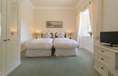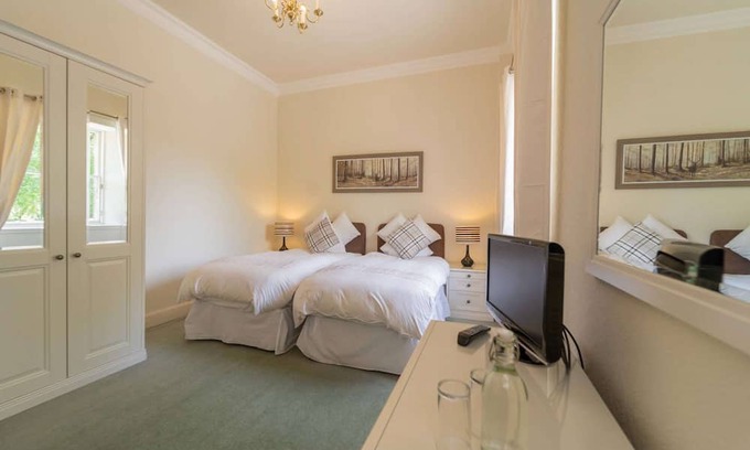 This spacious twin room, located on the first floor, boasts relaxing neutral decor, providing a delightful view of the tranquil woodland area at the back. The space includes an entry hall, a family-sized ensuite bathroom equipped with a shower, and adaptable twin or double beds, complete with side tables and lamps. Additional amenities feature a spacious wardrobe, an armchair and a dressing table.