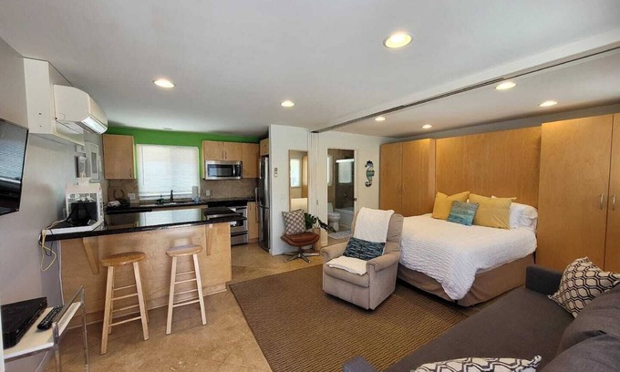 Newly renovated studio condo. New designer kitchen and granite countertops and stainless steel appliances. Travertine flooring and travertine bathroom. Full AC and heating for comfortable climate control. Fully outfitted kitchen with all the tools, plates, cups, bowls, etc should you want to cook during your stay. Two countertop height stools are included for dining. If you would like additional stools, please contact us 1 week in advance. Designated uncovered parking space is included + street parking is also available. We provide beach chairs, towels, and an umbrella. Bike rentals are available just up the street.