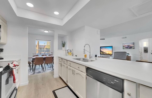 Inside, the home boasts a well-equipped kitchen with modern appliances, including a refrigerator, microwave, and dishwasher, ensuring you have everything you need for meal preparation. The inviting living area is perfect for unwinding after a day of exploring, featuring comfortable seating and entertainment options.