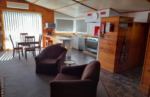 The lounge is furnished with two three-seater sofas, one of which folds out to a double sofa bed, and two single-seater lounge chairs. The second bedroom also includes two single recliners with lovely views of the deck and the National Park.