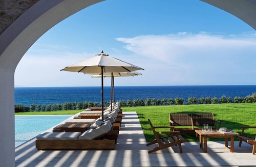 The spectacular view to the endless blue of the sea, together with the 200 m² swimming pool, maximize the essence of serenity and fun –a unique gift of the Lesante Cape.
