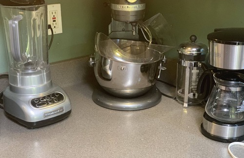 Pendant lights over breakfast counter made of solid cherry from local artisan. Corian counters and designer cabinets with under cabinet LED lighting. Pantry has beautifully restored vintage metal cabinets and serving cart with even more pots, pans, bowls, glassware -- and room to put away the food you buy.