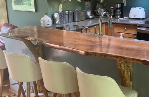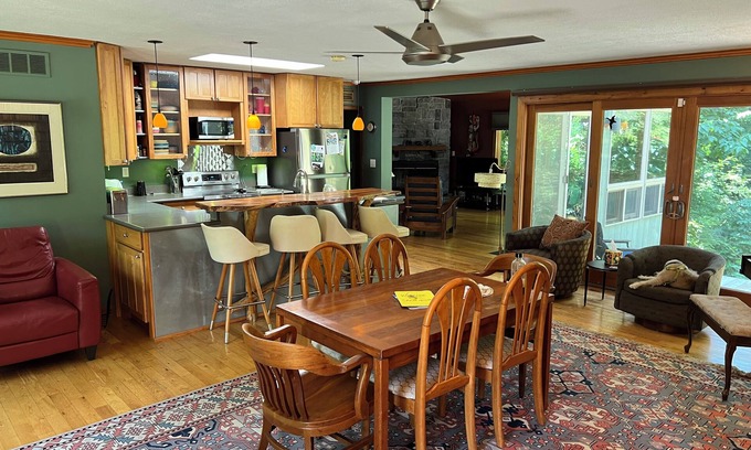 Living room has European leather sectional, Stickley chair and ottoman, marble tables, stone fireplace, large TV, oversized day bed, green vintage Formica table and chairs, vaulted ceiling, 5 gigantic picture windows, 8 sliding windows and three windows at the top that open with remote, bringing in fresh air from all four directions, plus the sounds and smells of the woods and creek. LR also has a sliding door onto the back deck. Four bird feeders right at the windows showcase dozens of species of colorful birds.