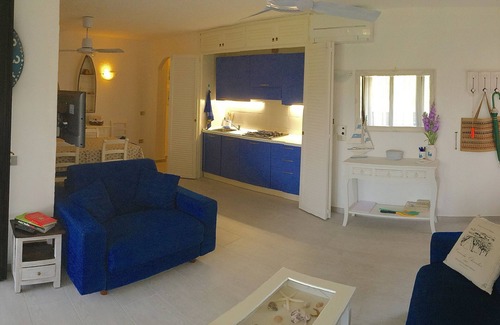 The Residence Punta Asfodeli, located on the outskirts in a quiet and sunny position, 50 m from the sea with a sandy beach, is surrounded by greenery with private internal parking. Available beyond the classic rest activities with an umbrella and two deck chairs, a tennis court, a playground for children, a beach volleyball court and a soccer field with grass. The adjacent wharf also carries out dinghy rental activities. A family of four with children will forget about many worries letting themselves be immersed in a splendid natural habitat still little contaminated. Older children will have the opportunity to meet with peers and participate in possible sports competitions on the beach. Grocery store at 1.5 km. Apartment 19A is rented full optional, with no additional extra charges for cleaning, water, gas, electricity; also includes a small welcome kit. Equipped with natural ventilation system with blades, and air conditioning system. A modern retractable kitchen, equipped with closable doors, which will be able to show off only when you need it. Equipped with large fridge with freezer, microwave, toaster, blender, 4 gas burners, dishwasher, served complete with dishes, glasses, cutlery for 6/12 people, pots, and various general support equipment. Terrace with relaxation area and extendable table. Two bedrooms, one double with 360 ° swivel TV and one with two single beds, large built-in wardrobes, bathroom with bidet, 50 liter boiler and splendid comfortable 1sqm shower with large shower head and sliding rail. Bed linen and towels are included together with other accessories: hairdryer, laundry, drying area, iron, vacuum cleaner and everything needed for cleaning. Reservations are accepted with small pets (one). Those traveling with pets must be aware that it is not possible to take them on the stretch of free beach (order of the Harbor Master's Office for the whole region) but can use the large park of the residence. Please collect any residues.