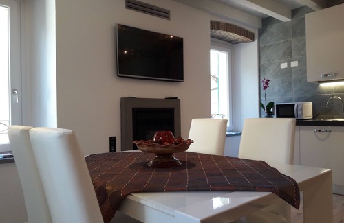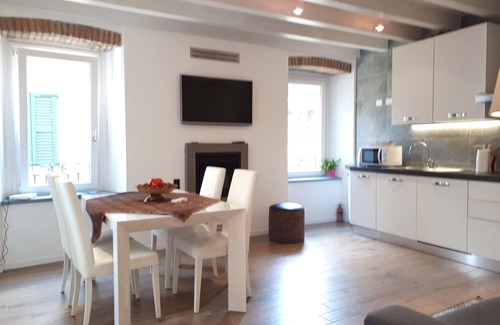 Newly renovated three-room apartment in June 2015 consisting of dining room, double bedroom with lake view, bedroom with 2 beds, sofa bed, bathroom with shower and toilet, small terrace, equipped with dishwasher, washing machine and winter and summer air conditioning in all rooms, pellet fireplace, hairdryer and iron, induction gas, fridge-freezer, TV, microwave, Wi-fi, bed linen and towels included.