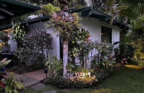 Capture the magic of this romantic cottage. Large picture windows, open beam ceilings and sky lights bring views of lush tropical gardens with towering Cook pines. Two covered lanais for pupus, mai-tais and outside dining. After an adventurous day on the Kalalau Trail, you can star gaze in your private hot tub under the moonlight in this serene, beautiful , private, half acre surrounding. 'Pau Hana', your Tiki, combined with landscape lighting, enhances the romance and intrigue of your evenings. You will find the gardens abundant with flowering tropical plants, orchids, fruit trees and water gardens. The avid gardeners and owners private home share a portion of this property .