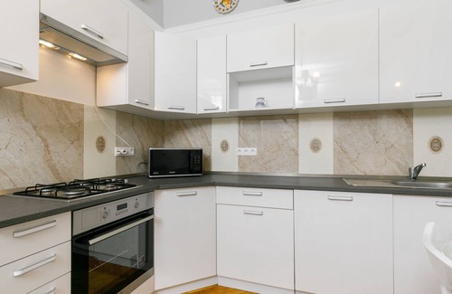 "Tilia 4", 4-room apartment on the ground floor. Comfortable furnishings: dining room with dining table and cable TV. Exit to the terrace. 1 room with 1 french bed (180 cm, length 200 cm). 1 room with 1 french bed (160 cm, length 200 cm) with 1 french bed (140 cm, length 200 cm), cable TV. Kitchen (oven, dishwasher, Gas stove, 4 gas rings, toaster, kettle, microwave, freezer, electric coffee machine) with dining table. Bath/WC, shower/WC. Heating (extra). Large terrace, patio. Parking (fenced 2 cars). MA19004503