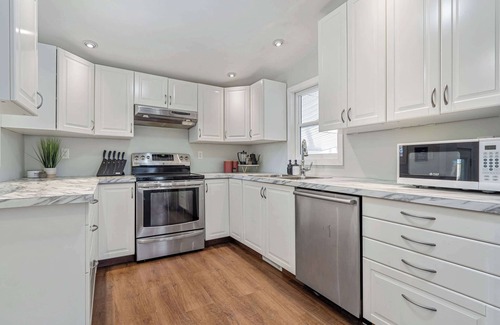 Our fully fenced backyard offers guests a BBQ, large green space, hot tub, and private outdoor dining area! When the day is over, snuggle up in one of our many bedrooms and watch a movie on our 55-inch TV!