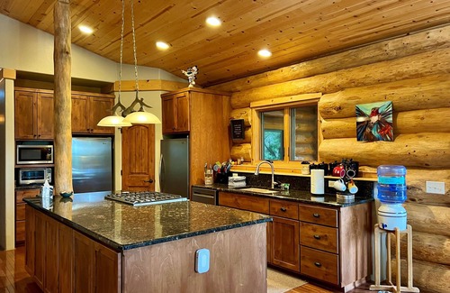 Hand-hewn logs and upscale furnishings create a unique ambiance.