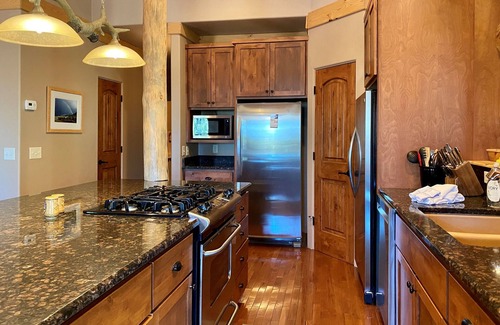 Fully equipped kitchen with stainless-steel appliances and granite island.