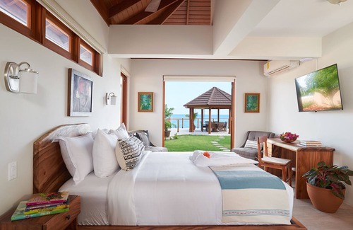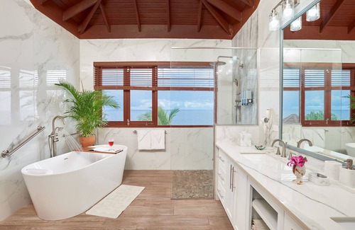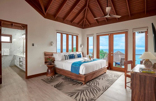 The villa offers luxury and comfort, from the beautifully carved furnishings to the sumptuous white bed linens. The infinity pool melts into the sapphire Caribbean Sea. Amenities abound. Three levels of relaxation include the infinity pool level, the romantic overlook dining level, and the sunset gazing level.