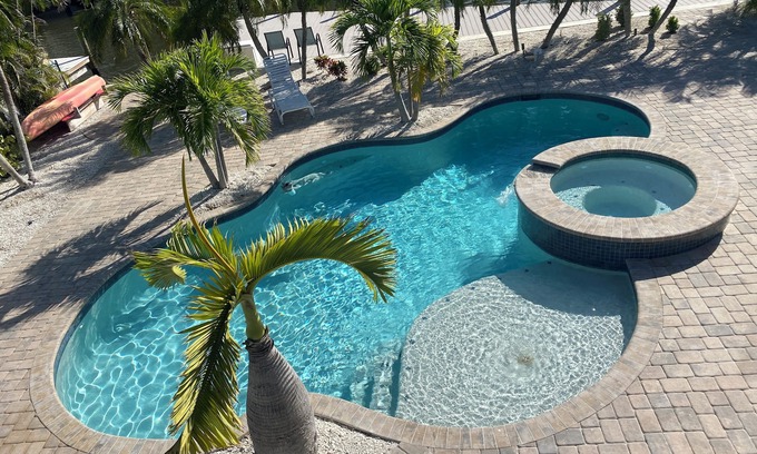 Primo Pool and Palms is walkable to the Beach, Times Square and Old San Carlos Blvd where you will find water sport rentals, beach shops and plenty of bar/restaurants. A beach cart and beach chairs are included that you can take down to the beach. Or you can just stay put and relax in the free form pool with tanning platform and attached spa surrounded by the tropically landscaped yard. You can also sit on the large dock and look for the manatees and dolphins that occasionally visit the canals. Maybe a kayak cruise for two into the intercoastal to look for Dolphin, Manatee or bird watching. Relax in the hammock and listen to the sway of the palms. And If you're a boater, bring/rent a boat and tie up to the dock and be just minutes from the Gulf! You will feel that you have found a hidden Oasis at Primo Pool and Palms!