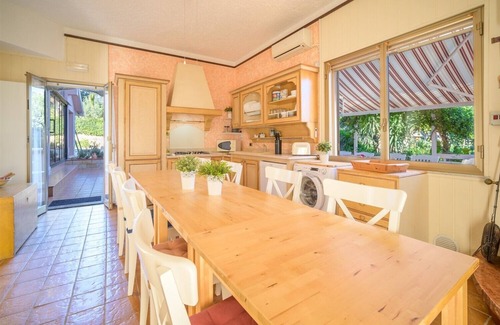 A large garden full of Mediterranean plants, flowerbeds and flowers, offers many furnished corners for sunbathing, with gazebos, a large hammock and an area for children with a large swing and a ping-pong table.