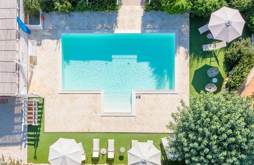 A large swimming pool, surrounded by greenery, is furnished with a solarium with sun beds, deck chairs and umbrellas, and offers an outdoor shower.
