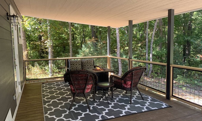 This tiny home has big luxury. It has a full kitchen, living room, closet space, and a queen bed in the loft. The deck is covered and sits on a private spot overlooking the woods. You will love this modern little home away from home. A tiny house on a private little street with 5 different cottages. Each one has its own parking and private space.