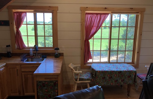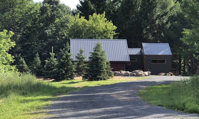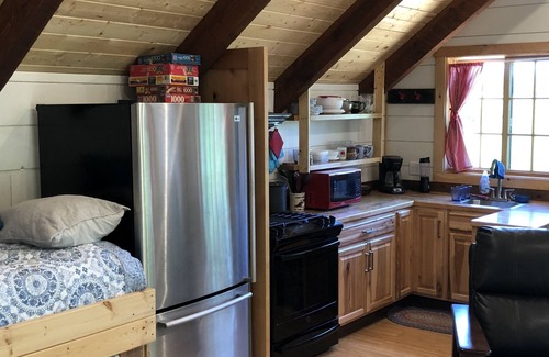 Here is your chance to try out a new wood beamed 520 sf 'not too tiny' house. Nestled on 20 special acres of nature you can roam to your heart's content. Plug in your RV for more beds if you have them. Wooded trails take you by Snowshoe Creek and to the lily pads and wild flowers on Little Wood Lake. Over the bridge and long dock are your included canoe, kayak and paddle boat to get around the lake. You'll find crappies, sunnies, northern pike and many largemouth bass. Lots of wildlife on our surrounding 20 acres. Inside you'll enjoy the super quiet air conditioning or heated comfort. Brazilian pecan and bamboo flooring. 2 TVs. Great new high-end stove and fridge with ice maker. Use the few acres of field for 4 wheeling or snowmobiling. Head to your pick of 3 cute towns each just 8 miles away or get your wine, sandwich, cheeses and ice cream at the Alpha Dairy and Bistro just 3 miles away. All towns have golf courses and restaurants. There is a terrific miniature golf course, upscale dining, antiquing, a multiplex theater and a beach in Siren. A home cooking restaurant and old fashioned bakery in Frederic. Enjoy many events at the lakeside park in Grantsburg. Visit a local mini-farm. When you are tired from all this action just come home to your fireplace and just relax. We now have Internet and WIFI for your cell phone.