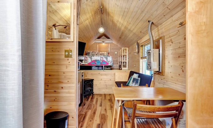 This open concept tiny house was built 100% by my husband, Elton. He lived in it for 5 years with his, now, 13 year old yellow lab, Macy. They had amazing adventures across North Dakota and Montana and recently the tiny home made the journey back to his home town in Vermont. We're now excited to share this incredible and unique home with you!