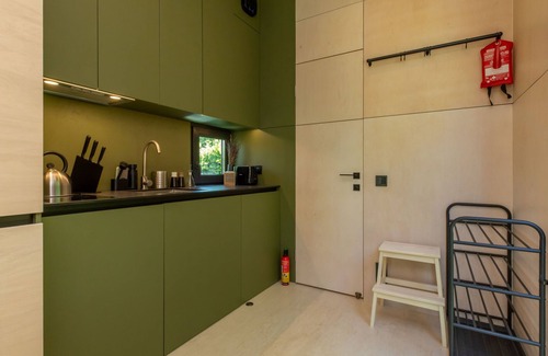 2-room chalet 15 m2. Very modern and cosy furnishings: small living/dining room with 2 beds (70 cm, length 200 cm). Small, open kitchen (2 induction hot plates, kettle, freezer). Shower/WC. Electric heating. Upper floor: (ladder) with 1 double bed (210 cm, length 200 cm). Large, lawn. Barbecue, deck chairs, sitting area. Facilities: hair dryer. Internet (WiFi, free). Parking at the house. Maximum 1 pet/ dog allowed.