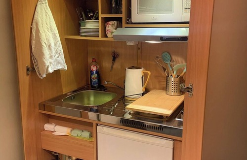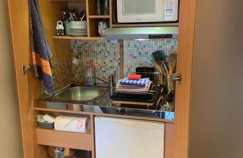 The kitchen is equipped with a stovetop, a refrigerator, a microwave, and a toaster.