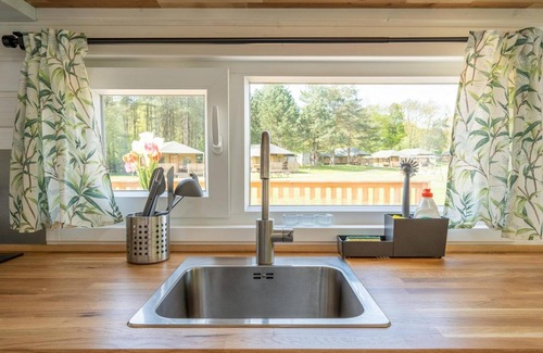 Experience a unique getaway in our cozy Tiny House, suitable for up to 6 people. The Tiny House features comfortable beds, a luxurious kitchen, private shower, and full bathroom facilities. From the covered veranda with a picnic table and lounge bench, you can enjoy an unobstructed view of the playground and stunning sunsets. Surrounded by nature, this spot offers peace and a true sense of freedom.