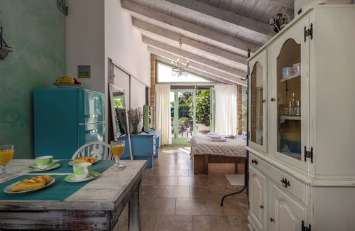 The cosy sleeping area has a wooden double bed, an antique wardrobe and a flat-screen TV. Then, glass doors lead out to a pretty garden. The owners have lavished as much care and attention on the outside space as on the interiors. Guests can enjoy meals al fresco on the shaded terrace next to the pool. Or they can relax on the sun loungers after a refreshing dip.